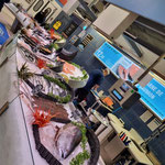Wat denk je van de grote visafdeling met van die lekkere grote garnalen.