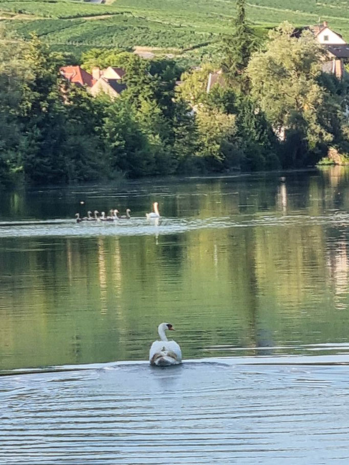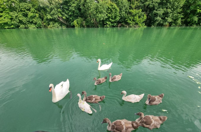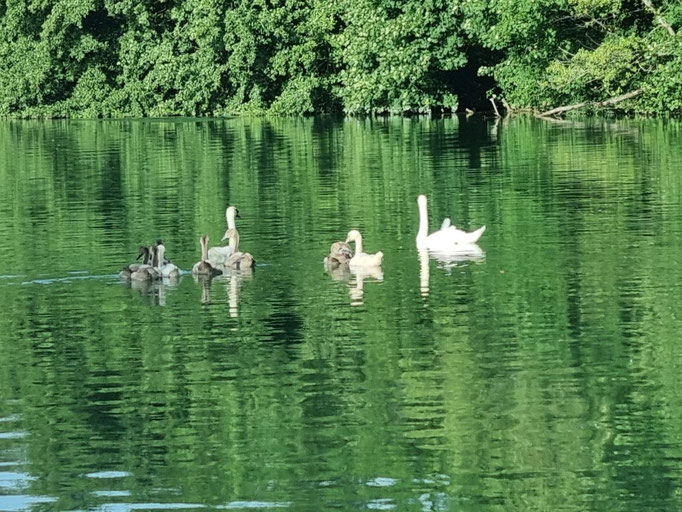 Elke avond bezoek van een zwanenfamilie met 8 kinderen.