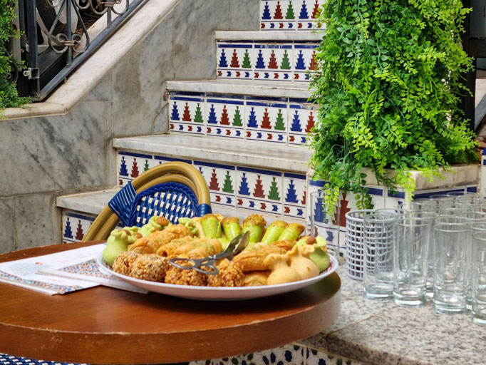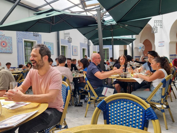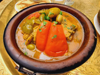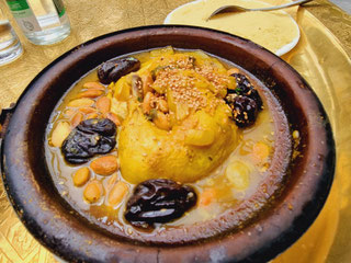 We hebben hier heerlijk thajine met kip en couscous, en thajine met lamsvlees en couscous met kaneel gegeten.